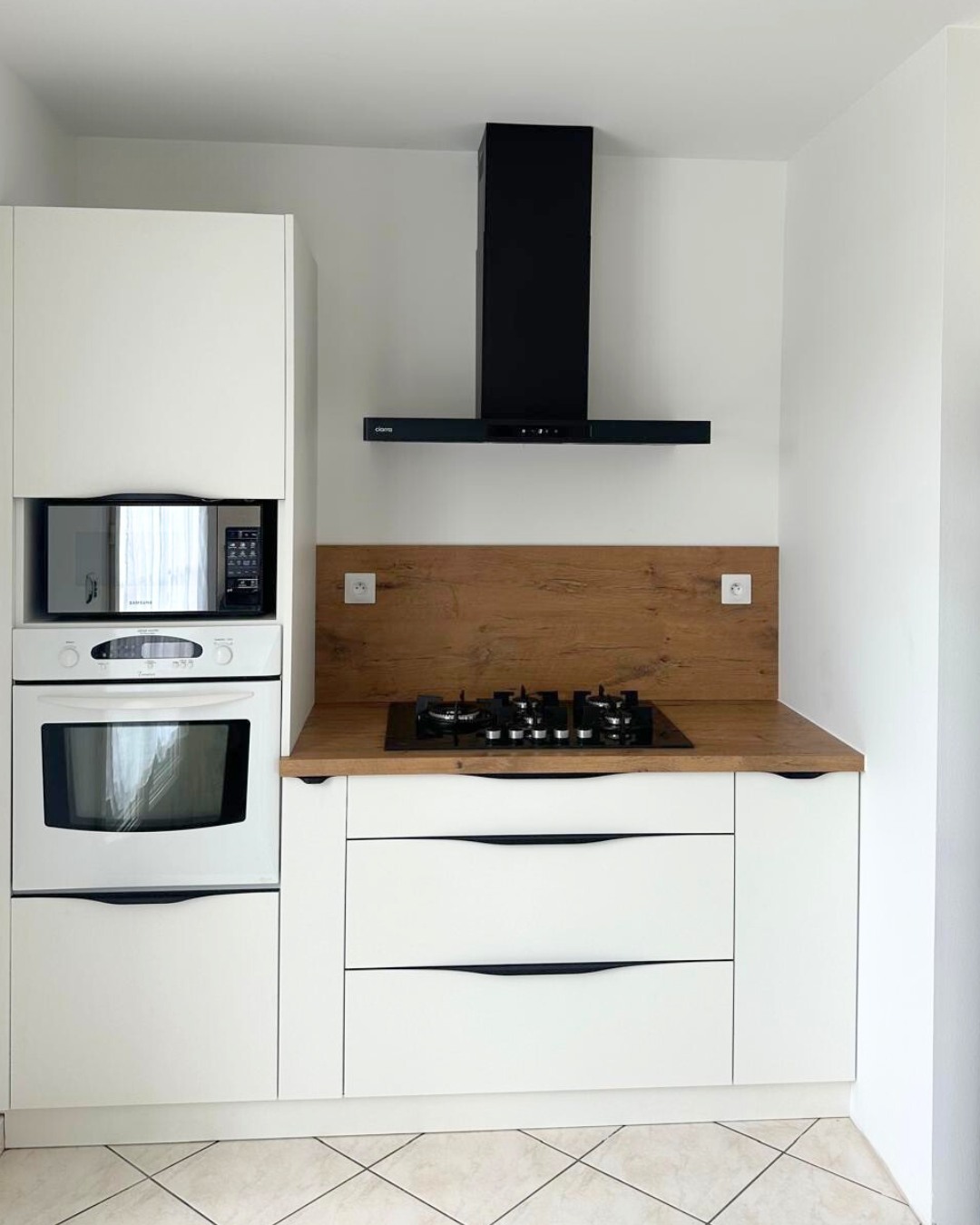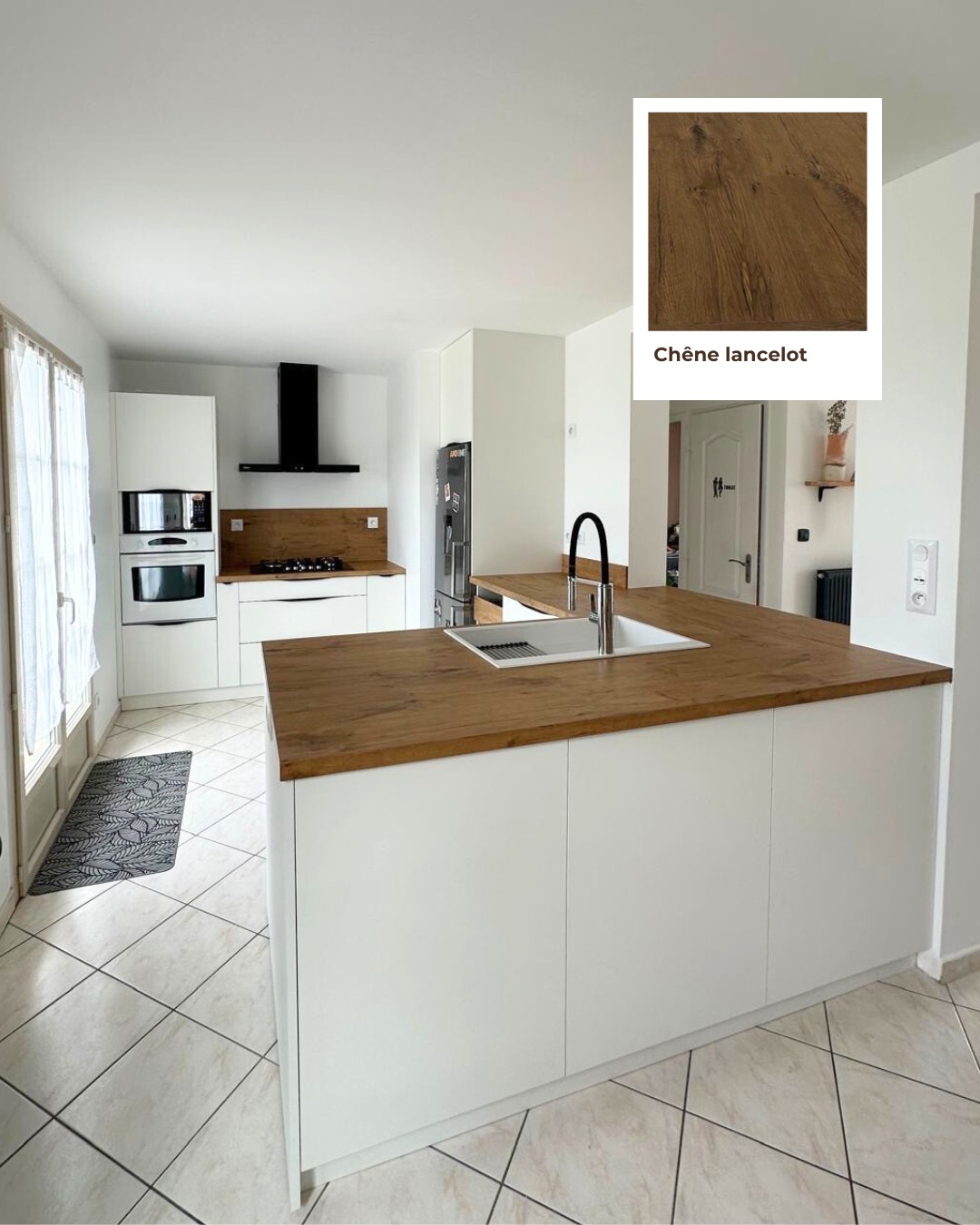 Actibois est récemment intervenu dans la réalisation d'une cuisine entièrement sur-mesure. Tons blanc cristal et chêne Lancelant, sublimé par des poignées sur chant noires : élégant et contemporain.