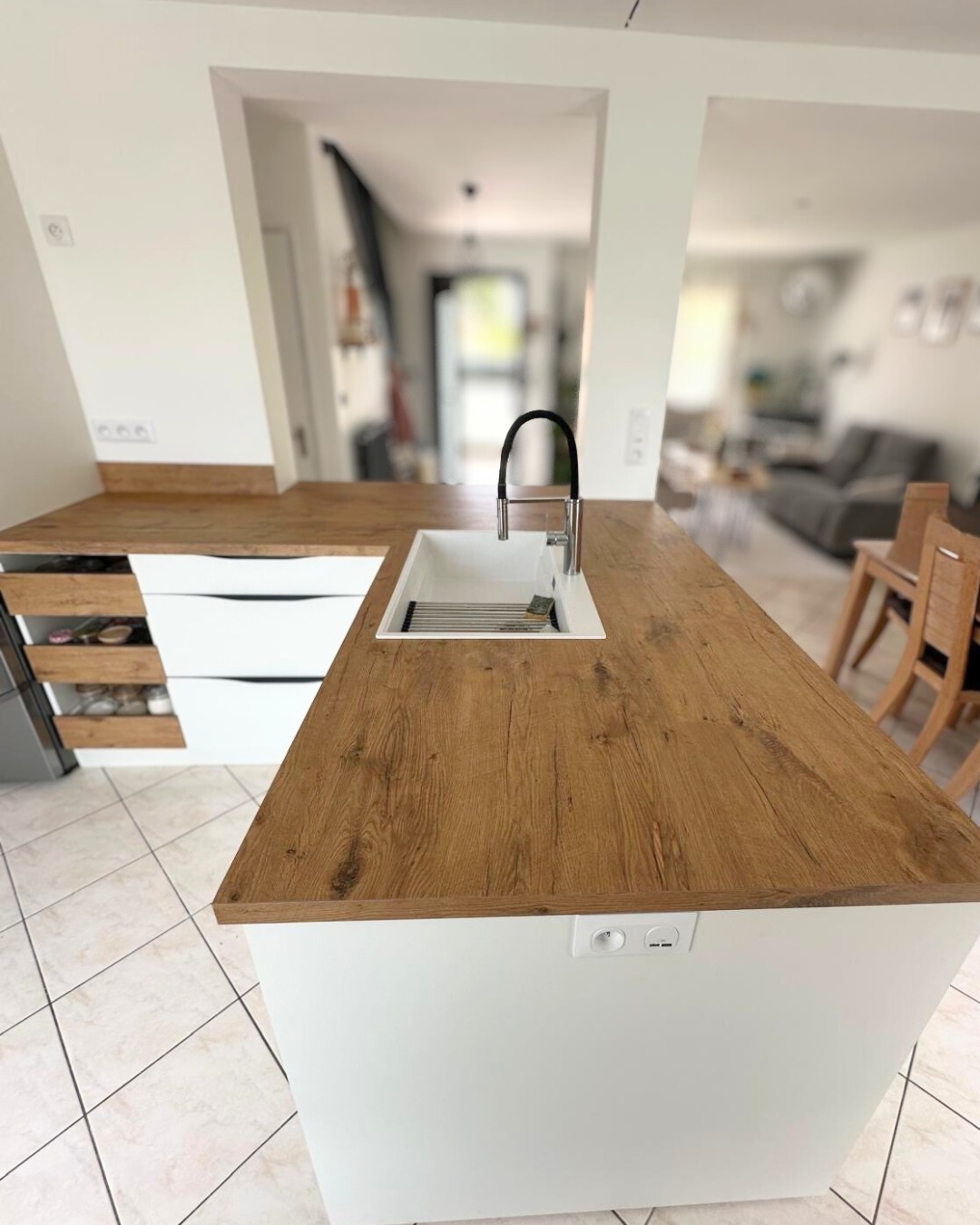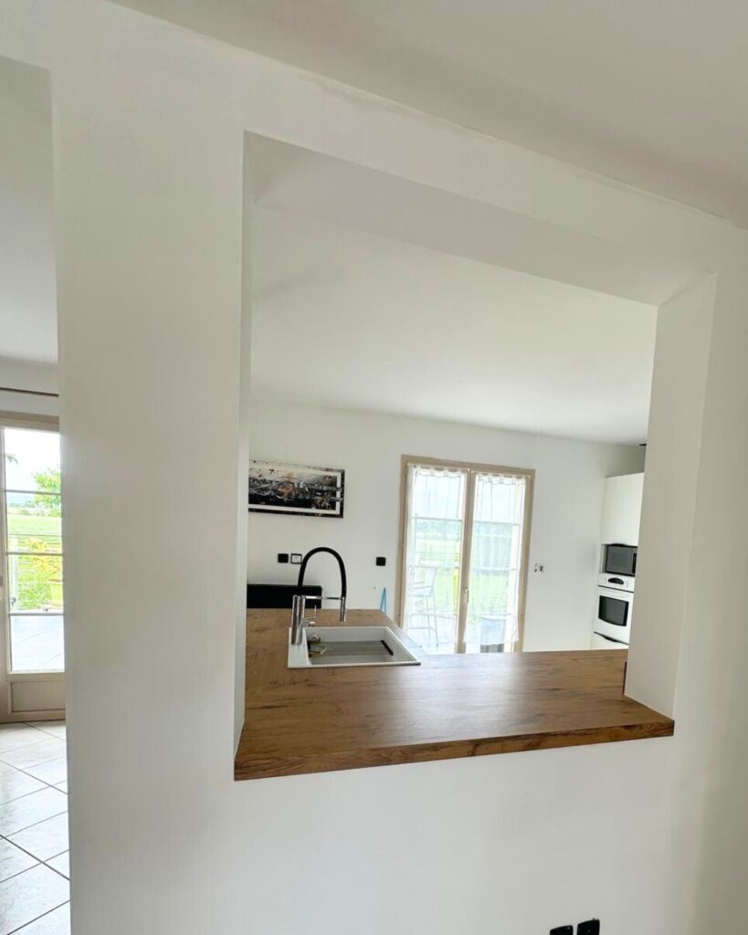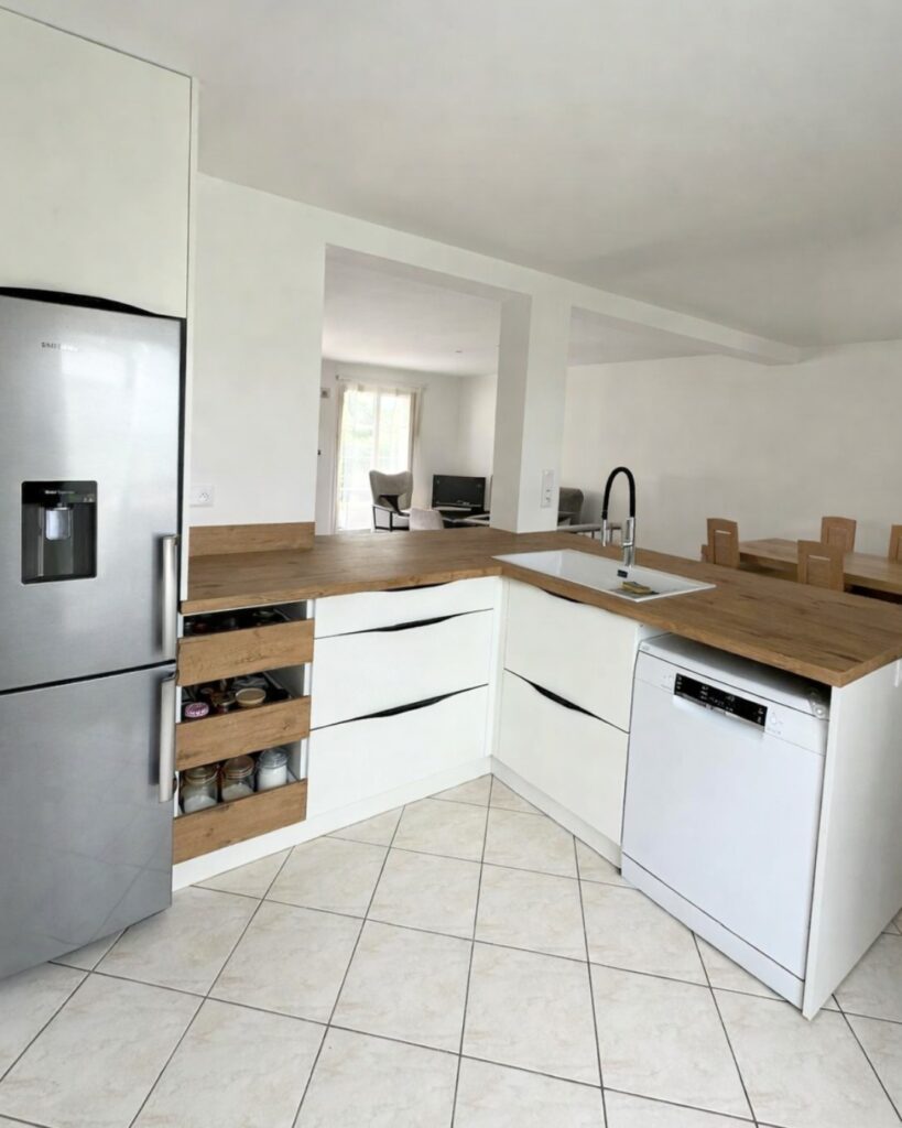 Le tablettage du plan de travail, également réalisé sur mesure, épouse avec précision la forme des murs et crée une continuité visuelle naturelle avec le salon. Un aménagement intelligent qui optimise l’espace tout en renforçant la convivialité de la pièce.